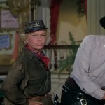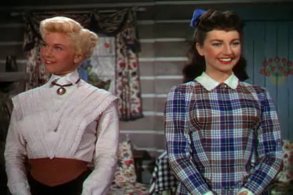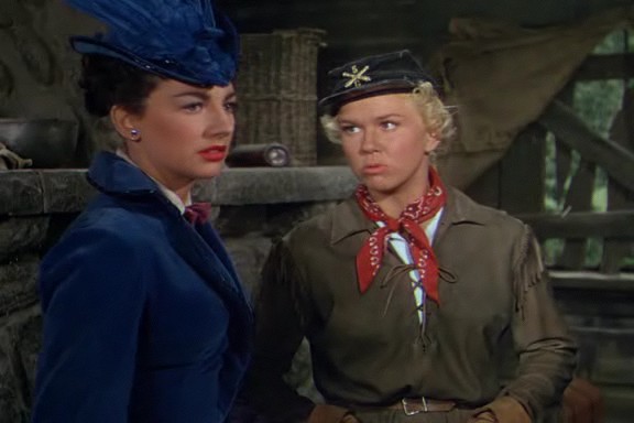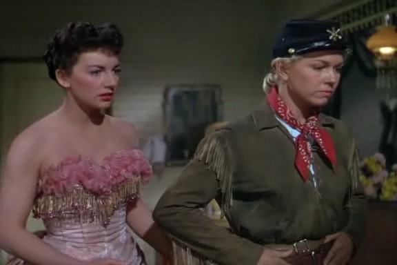 Pourtant, le personnage de Calamity est réellement superbe. Elle est extrêmement belle vêtue en militaire, elle jure comme un charretier et roule des épaules comme personne. Doris Day est époustouflante et inoubliable dans ce rôle. Malheureusement, aucune femme ne peut apprécier d’être confondue avec un homme. Lorsque Katie avoue à Calamity qu’elle l’a prise pour un homme celle-ci éclate de rire et s’en amuse avant de réaliser que ce n’est pas si amusant. Pourquoi ? L’installation des deux jeunes femmes ensemble ne porte jamais à confusion. Elles sont simplement amies et Calamity Jane a besoin que quelqu’un lui apprenne à être une femme, une vraie femme. C’est-à-dire qu’elle doit apprendre à tenir sa maison (le passage de la rénovation est à ce titre des plus explicites) et ne plus se battre. Fini le fusil et les courses poursuites avec les indiens, elle doit se concentrer sur des tâches typiquement féminines si elle veut se trouver un homme. Et comme elle rêve d’un homme.