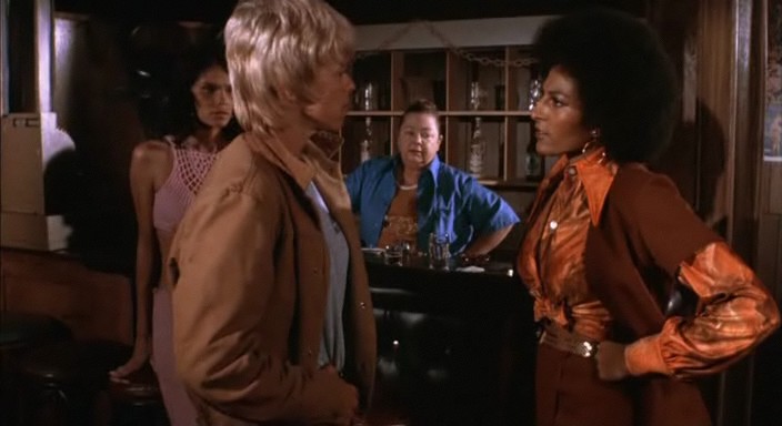 L’intérêt lesbien réside dans le bar où Claudia a décidé d’aller étancher sa soif en attendant Foxy. Elles sont toutes les deux poursuivies par les tueurs de Steve et Claudia ne trouve rien de mieux que d’aller se saouler dans un bar lesbien. Vous vous doutez qu’il est rempli de femmes et qu’il n’y a aucun homme. Bien évidemment, ces femmes sont vêtues de manière plutôt masculine, ont les cheveux courts et Claudia et Foxy détonnent dans ce paysage, avec leurs tenues sexys, voyantes et près du corps.
