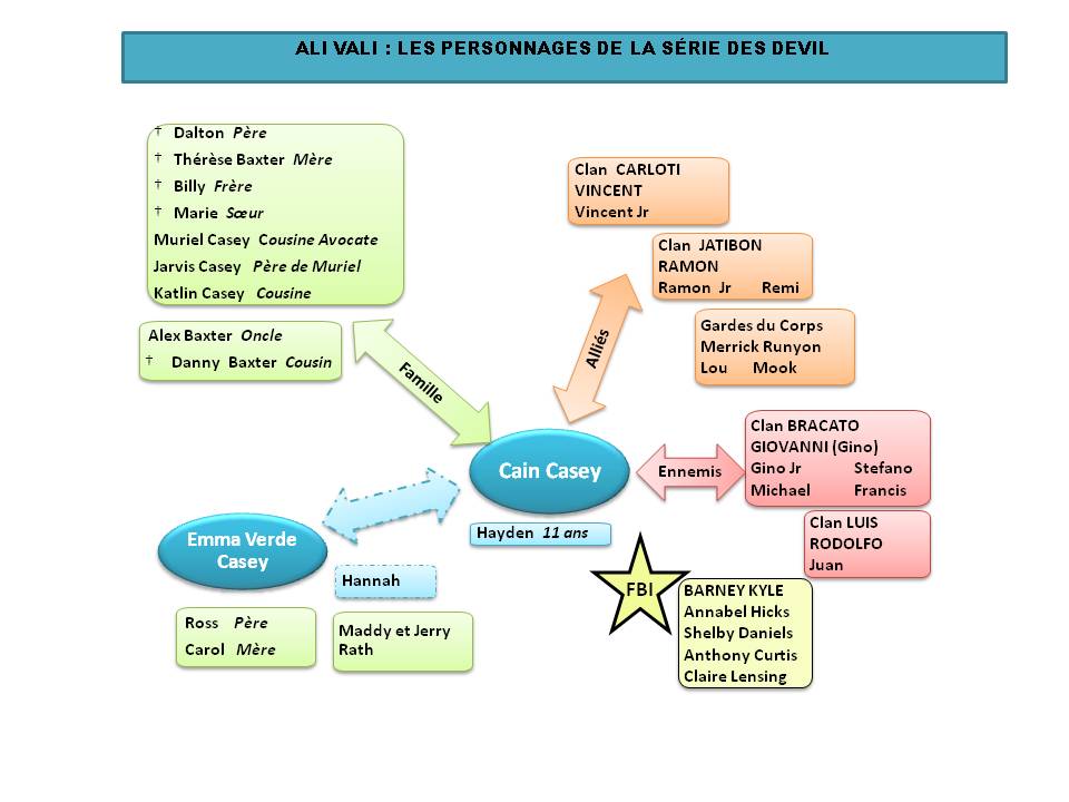 Cain Casey et son clan : elle est le chef de ce qu’il reste du clan Casey après la mort de son père Dalton, de sa mère Thérèse et de son frère Billy, plus d’une dizaine d’années avant le début du premier livre, The Devil inside. Sa sœur Mary vient d’être enterrée quand la série commence. Il ne lui reste que son fils Hayden, 11 ans, sa cousine Muriel, et le père de celle-ci Jarvis Casey.